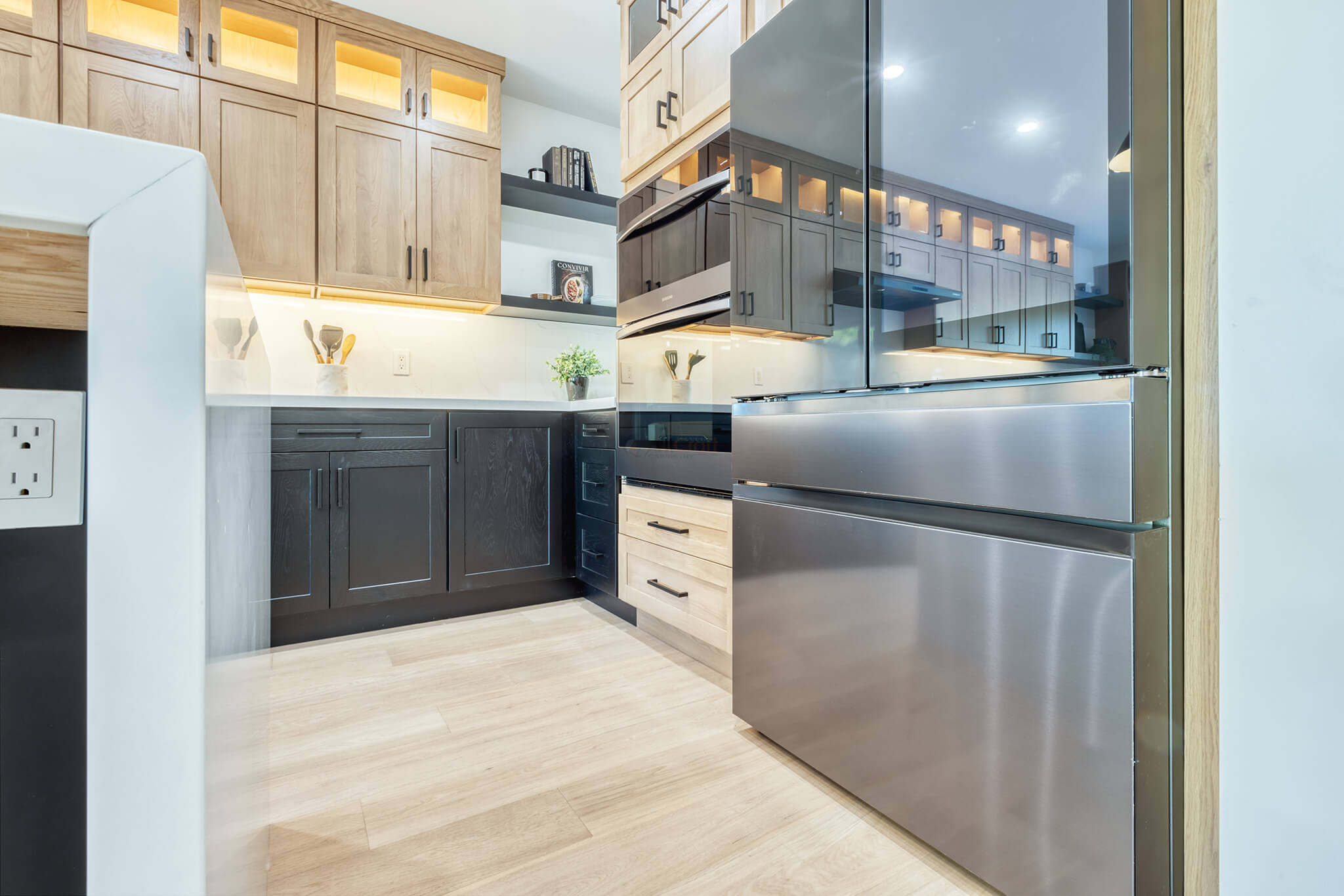 Two-tone kitchen cabinets can work with a variety of kitchen styles. This kitchen is a combination of Classe and Whisky Royale.